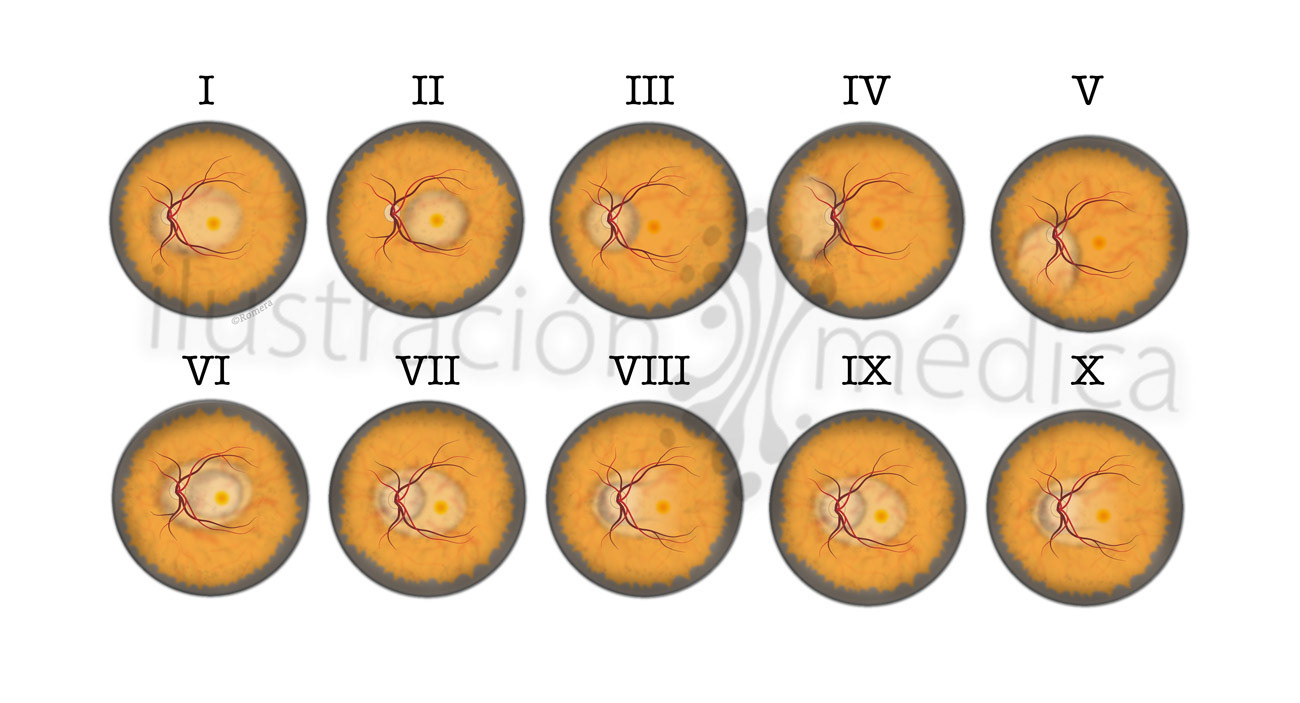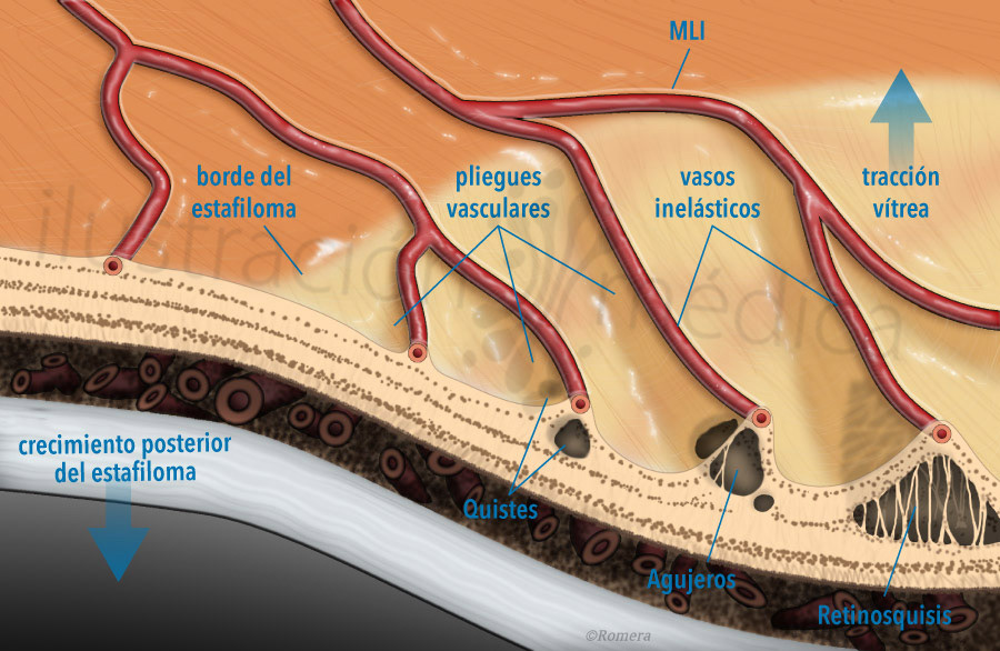Formación de pliegues vasculares, quistes y agujeros perivasculares en la retina con miopía magna.
